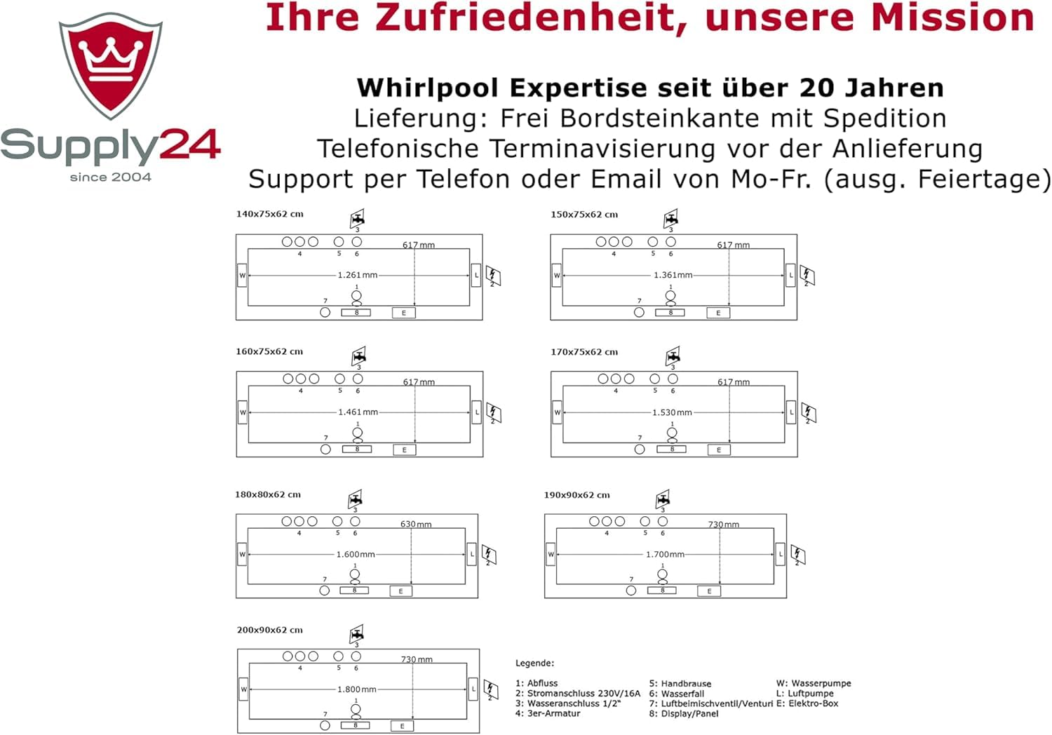 • Größen: 140×75 bis 200×90 cm verfügbar - je nach Größe 22 oder 24 Düsen
