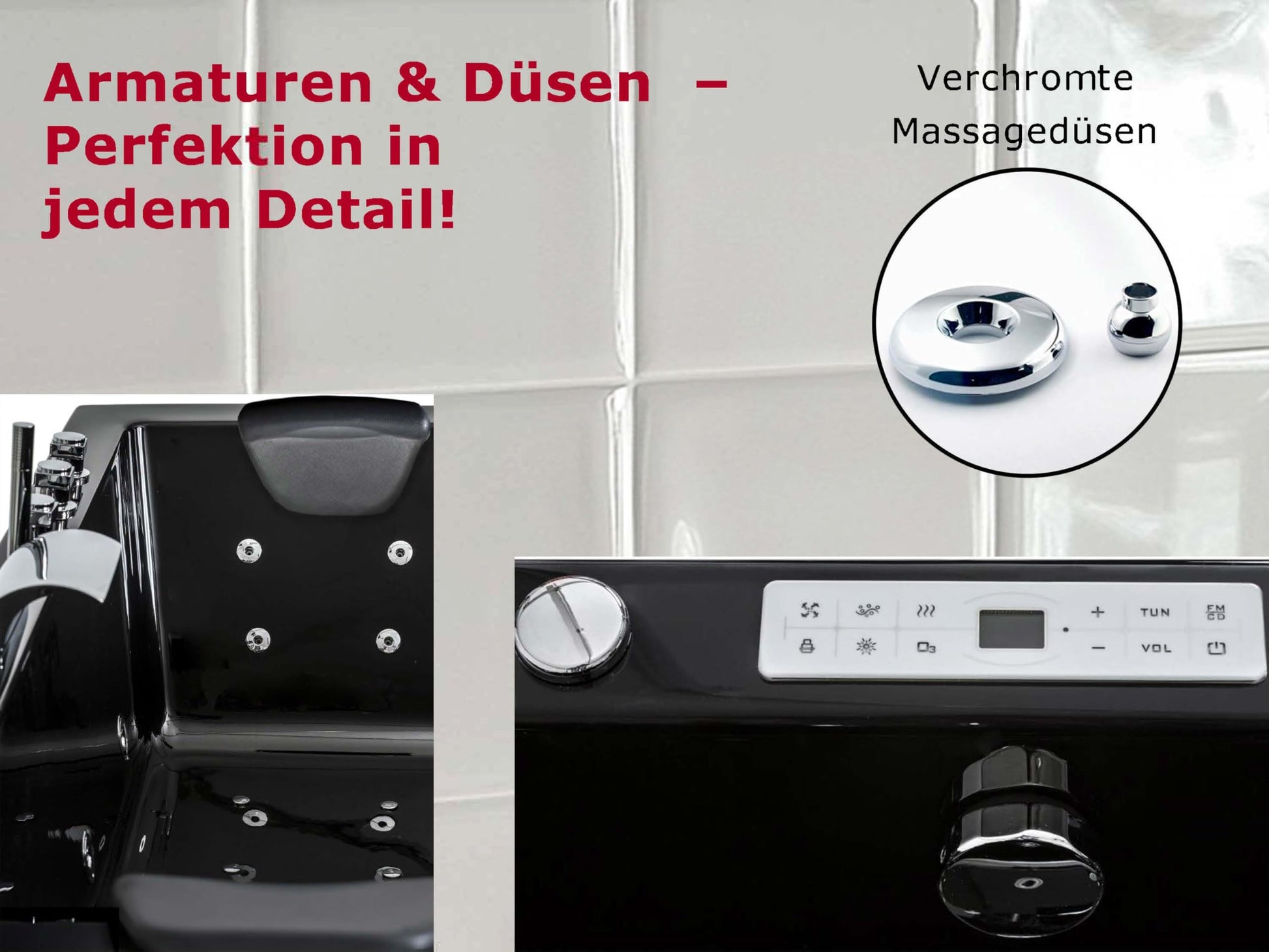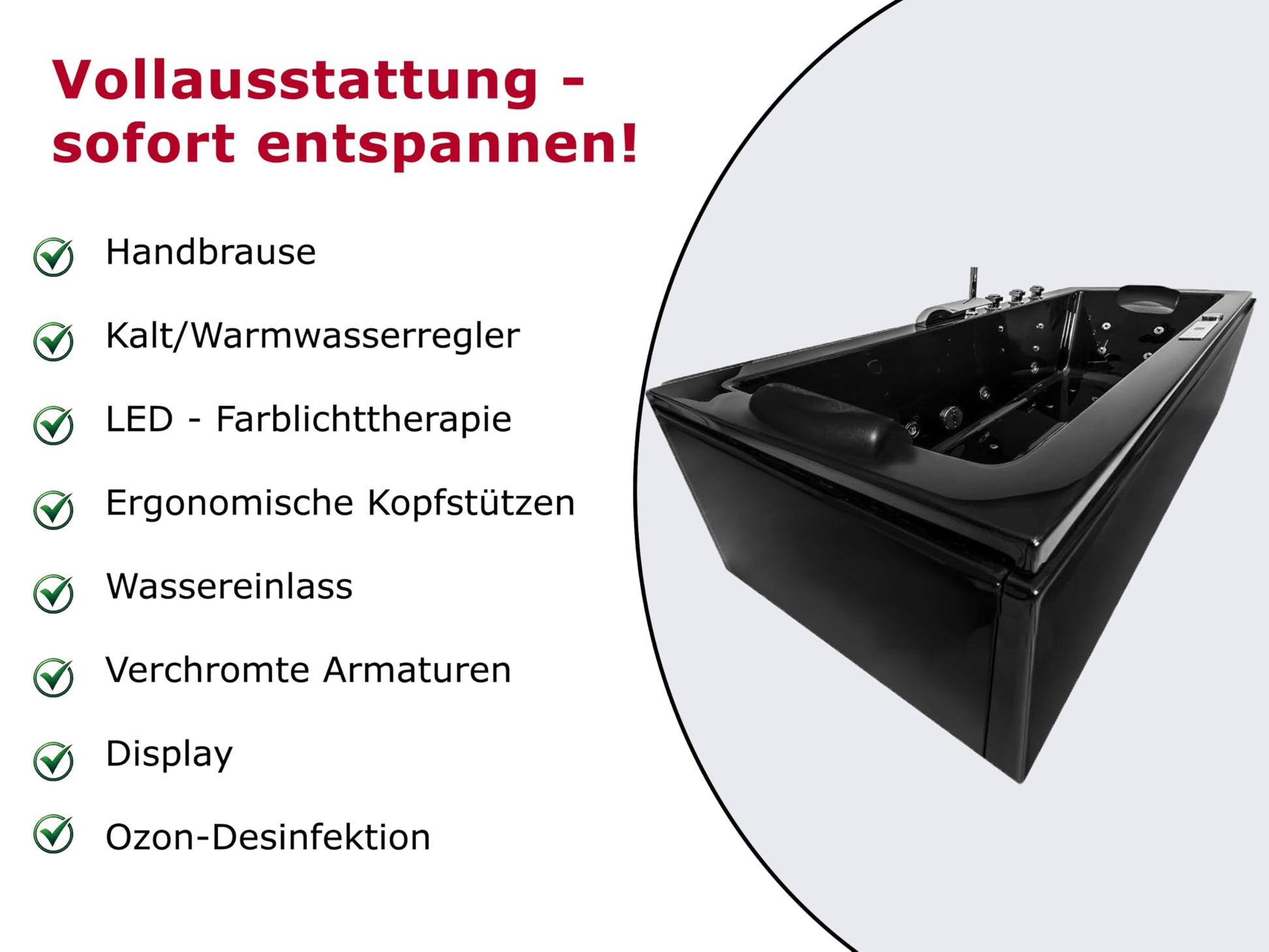 Vollausstattung: 22-24 kraftvolle Massagedüsen (Hydrojet, Rücken, Bodenluft), 2 Kopfstützen, LED-Farblichttherapie & Bluetooth-Radio