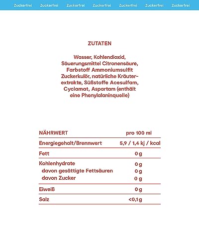Ingredients: Water, carbon dioxide, acidifier citric acid, color ammonium sulfite caramel, natural herbal extracts, sweeteners acesulfame, cyclamate, aspartame (contains a source of phenylalanine).