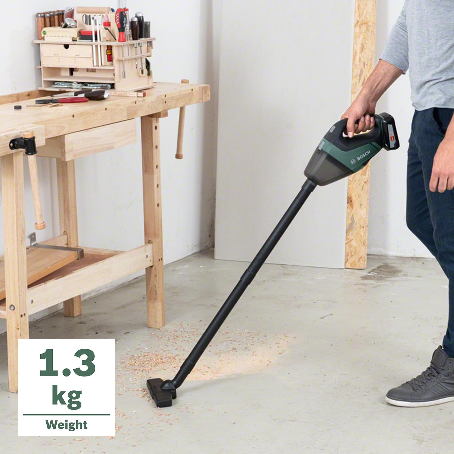 The Bosch UniversalVac 18 is a powerful cordless handheld vacuum cleaner for home, car, and garden. With its extensive accessories and powerful 18V system, it's suitable for a wide range of cleaning tasks – from floors and upholstery to tight spaces.