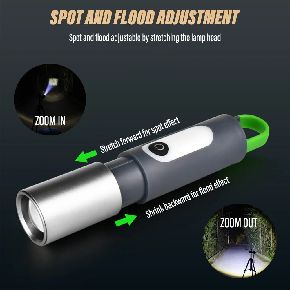 Extremely bright LED+COB light : Equipped with high-quality light beads, the flashlight offers maximum brightness for all outdoor applications.