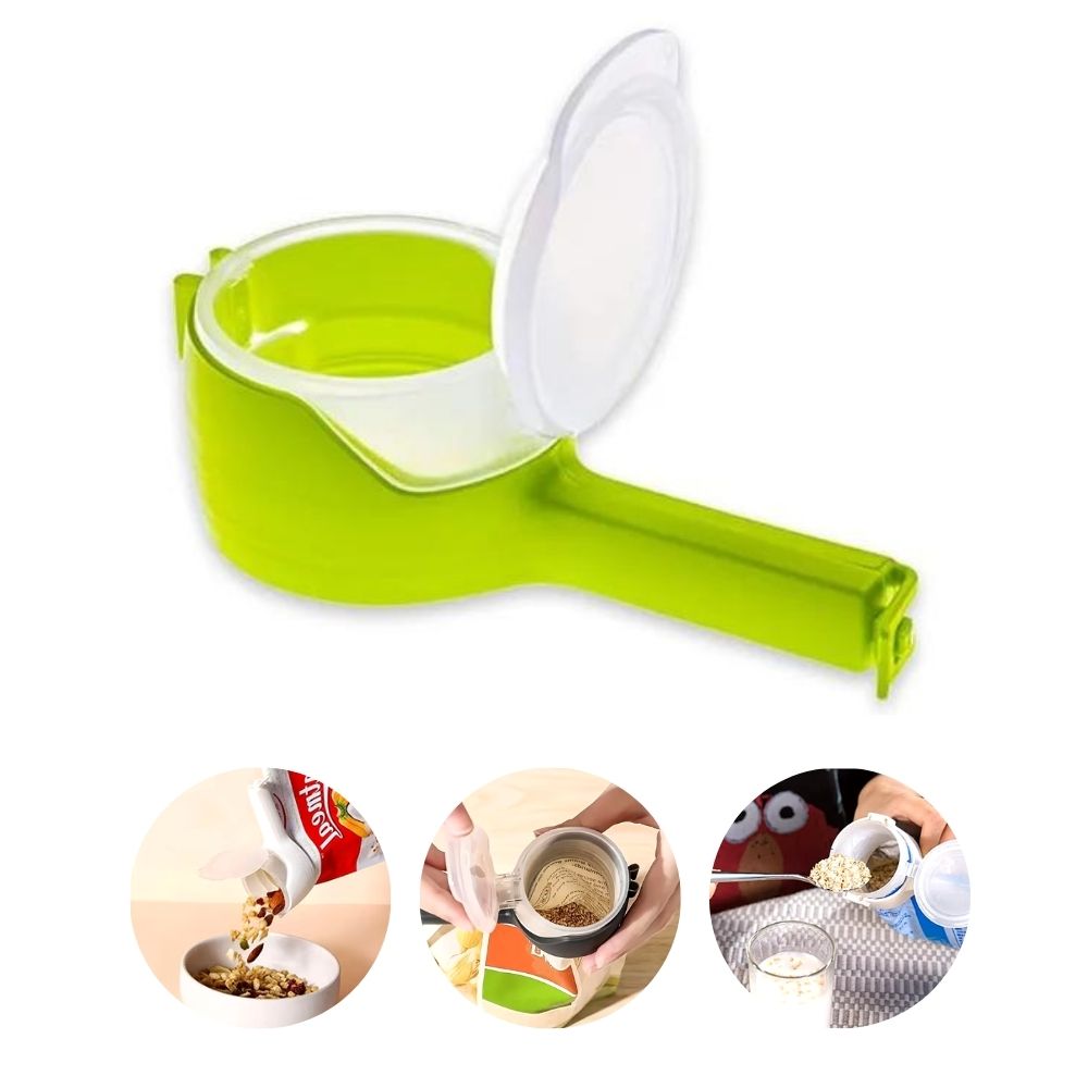 Der Clip bietet nicht nur einen sicheren Verschluss, sondern verfügt auch über einen integrierten Ausgießer, der das Ausgeben von Haferflocken, Nüssen oder Snacks so einfach wie nie macht - ganz ohne Öffnen des gesamten Beutels.