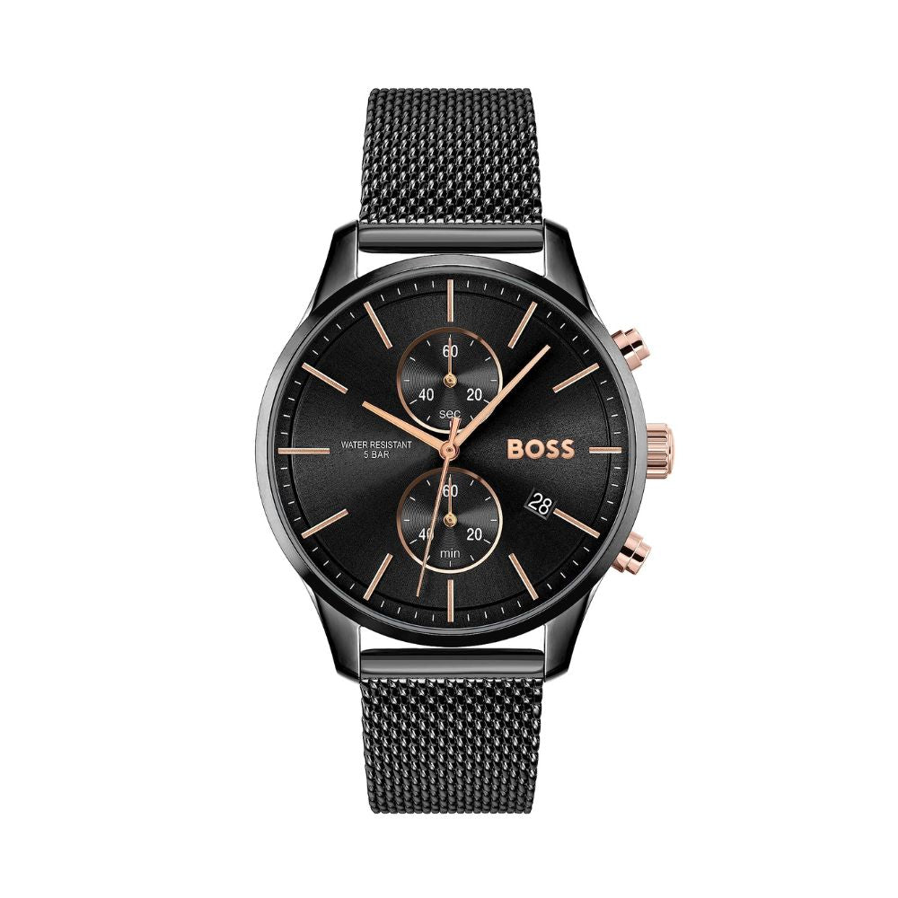 BOSS Chronograph Quarz Uhr für Herren (1513811) mit schwarzes Edelstahl-Mesh-Gliederarmband