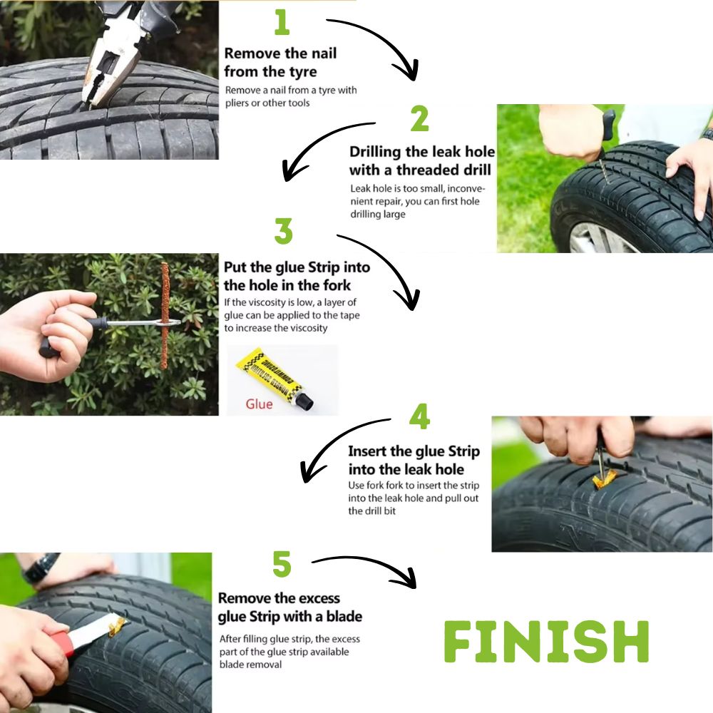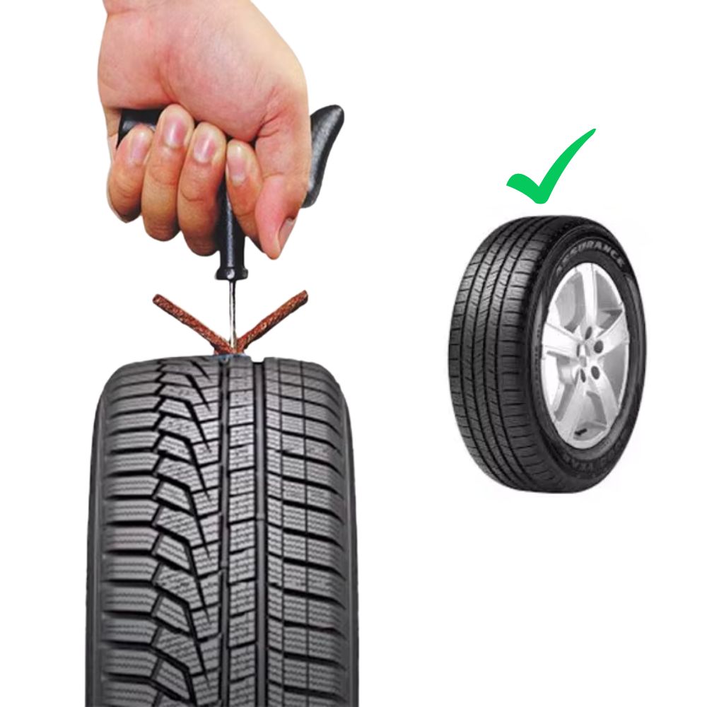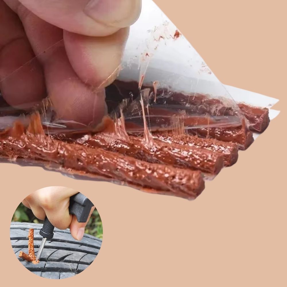 Ich habe meinen Reifen mit diesem Kit repariert und viel Geld gespart. Es hilft, wenn Sie der Nadelspitze mit dem Gummist reifen etwas Gummi lösung hinzufügen.